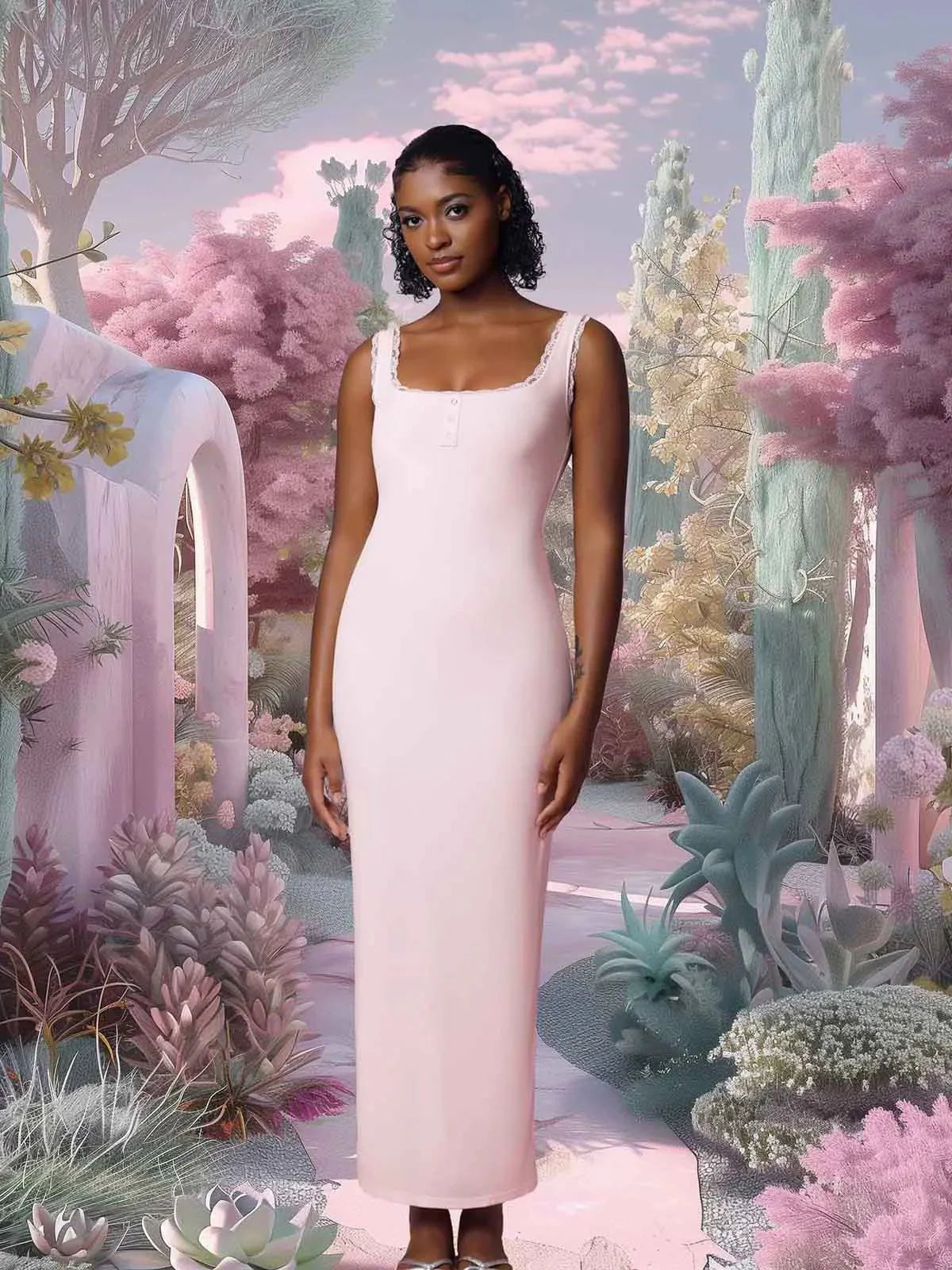 Shapewear Modal Slimming Lace Trim Henley Tank Maxi Dress