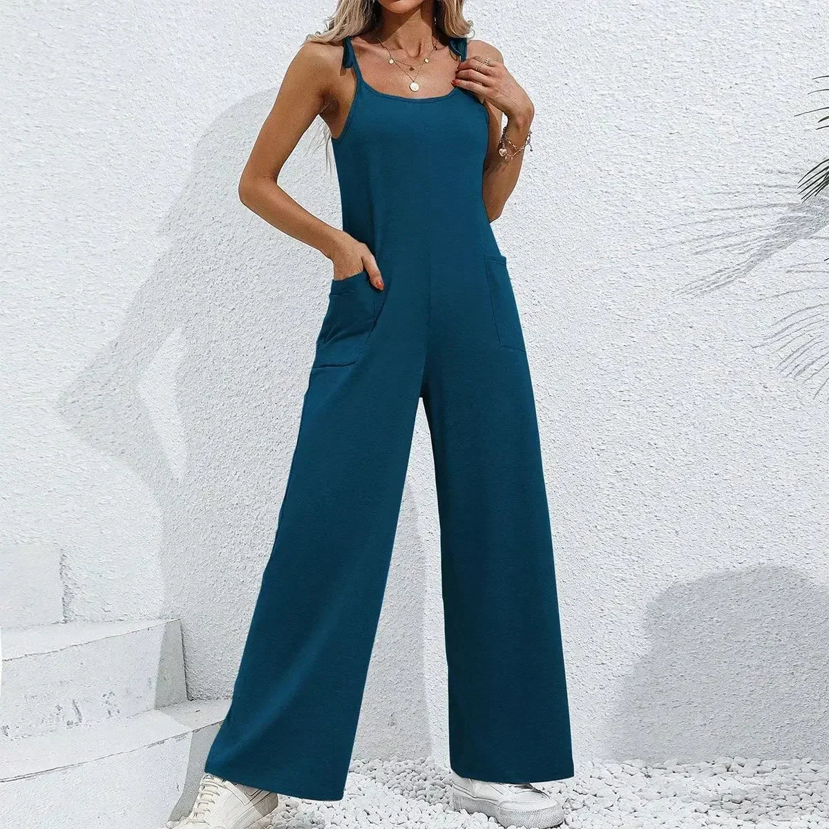 Step into all-day ease with a versatile jumpsuit designed for both lounging and life on the go. The wide-leg silhouette and flattering shape make it a wardrobe essential. A subtle square neckline, adjustable thin straps, and easy pull-on style ensure a perfect, fuss-free fit. A handy side pocket adds everyday practicality.